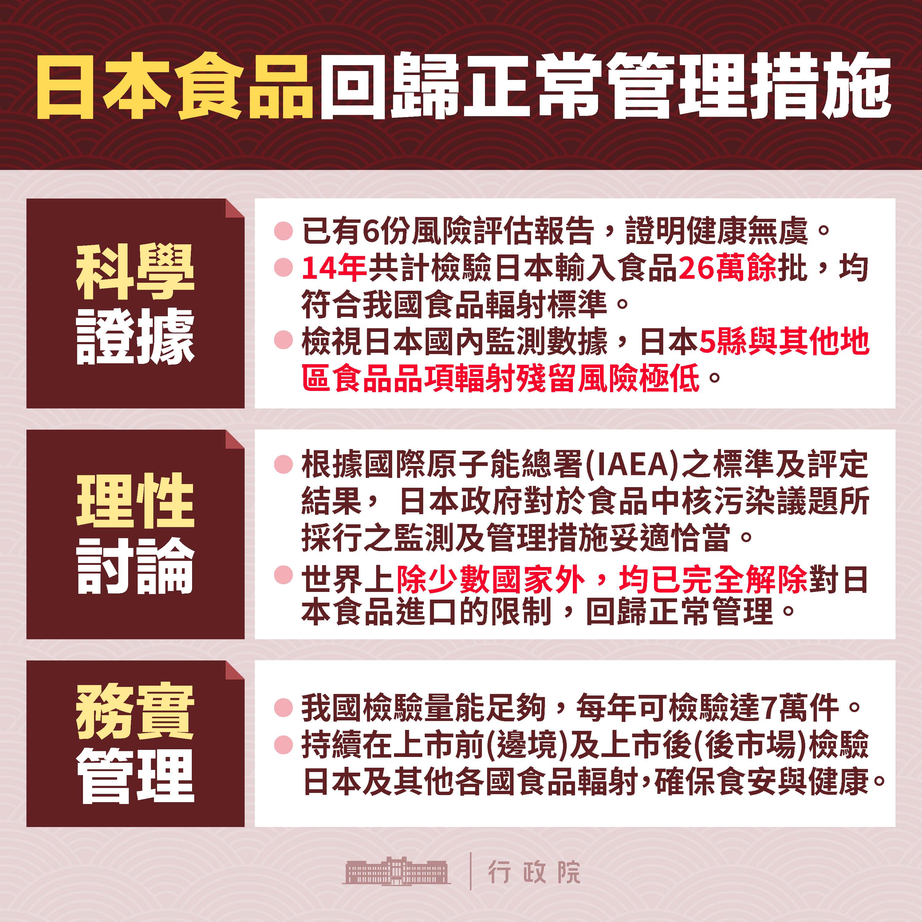政府在優先確保食安、維護國民健康的前提下,參考及接軌世界多國管理,依科學證據與國際標準,評估日本食品應回歸正常管理措施。