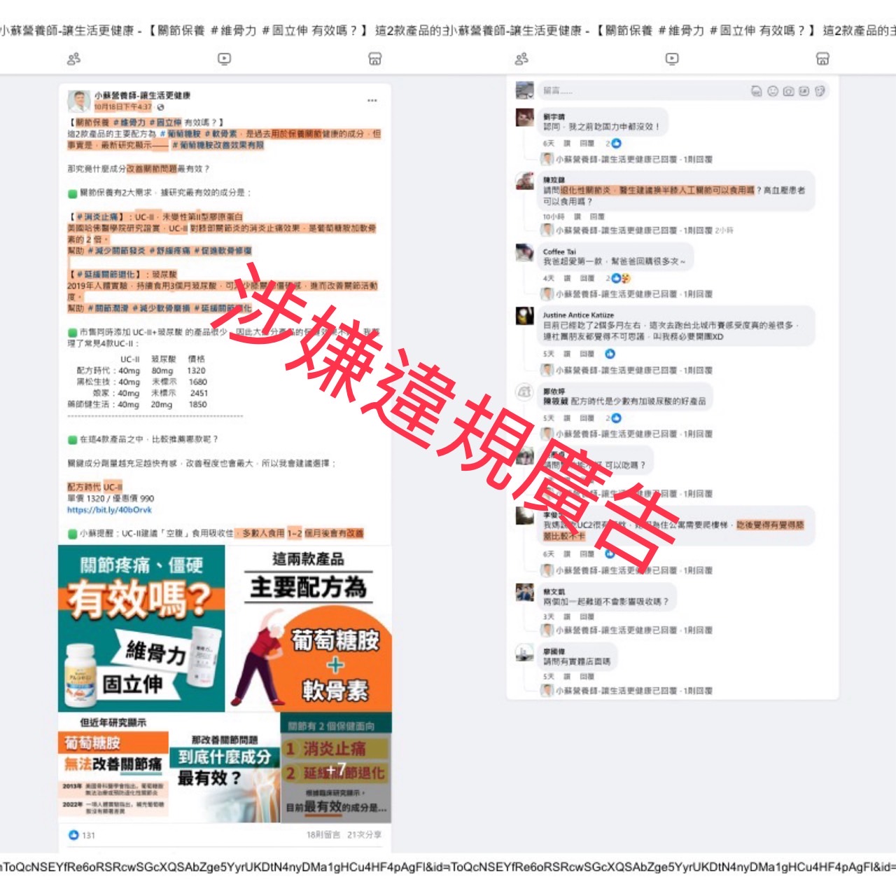 | 涉嫌違規宣稱詞句 | ;關節保養 #維骨力 #固立伸 ... #葡萄糖胺 #軟骨素,是過去用於保養關節健康的成分,但事實是,最新研究顯示—— #葡萄糖胺改善效果有限【#消炎止痛】:UC-II,未變性第II型膠原蛋白美國哈佛 |
