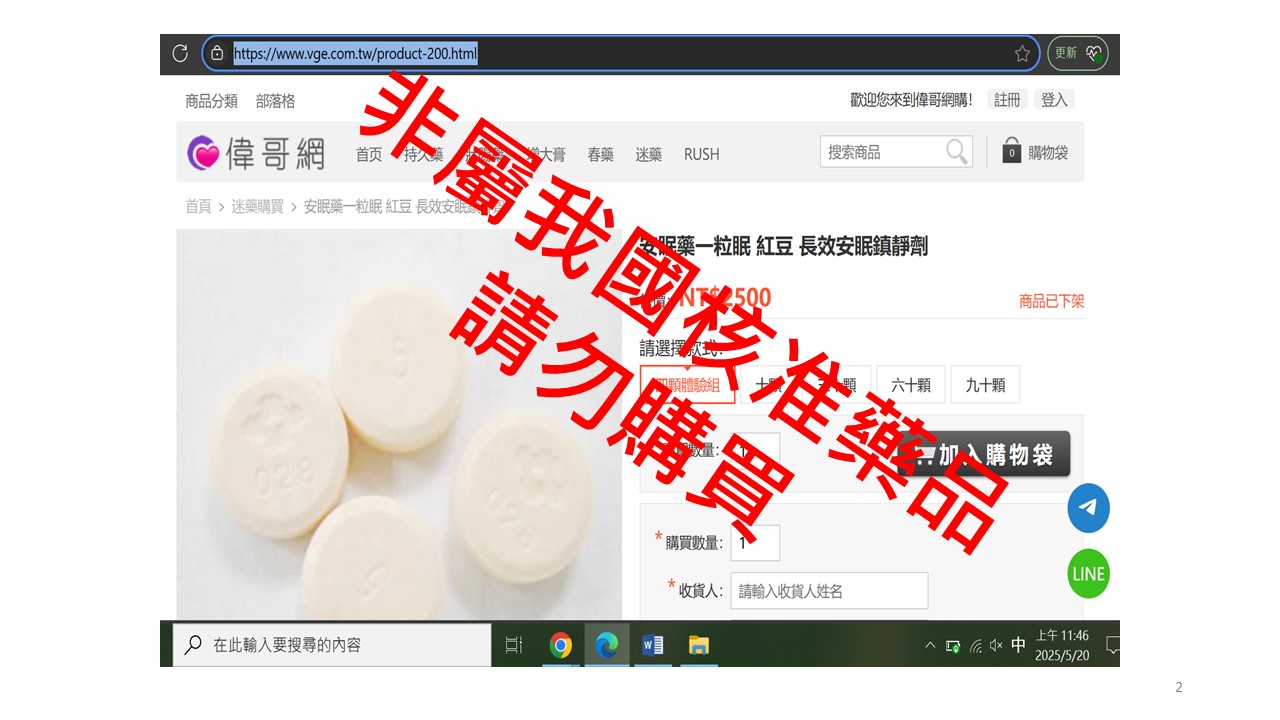 管制藥品皆屬醫師處方用藥,不得於網路販售,民眾如有疾病所需,須經醫師診療後方能憑其處方調劑供應,食藥署呼籲民眾切勿購買來路不明之產品。