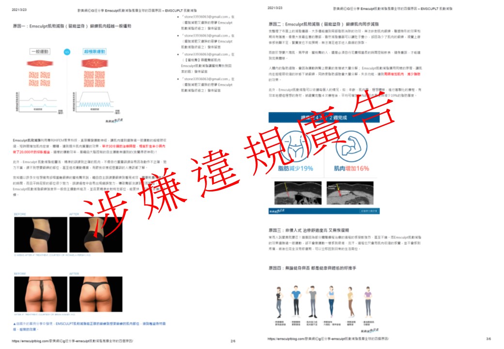 | 涉嫌違規宣稱詞句 | …減脂…增加肌肉,同時減少脂肪的Emsculpt肌動減脂…肌動減脂…磁能塑身…達到雕塑身材曲線、翹臀的效果…總療程4次…2週完成…脂肪減少19%...肌肉增加16%...肌肉量不足…提臀翹臀者… |