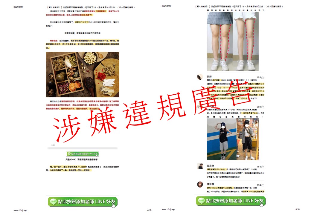 | 涉嫌違規宣稱詞句 | …長高…增高前後,判若兩人…身高的原因…最終成功增高了9公分…增高…身高比較矮,導致我經常被朋友打趣小短腿…因為打生長激素和做斷骨增高手術不僅費用昂貴、不能保證一定能長高,還有很多風險… |