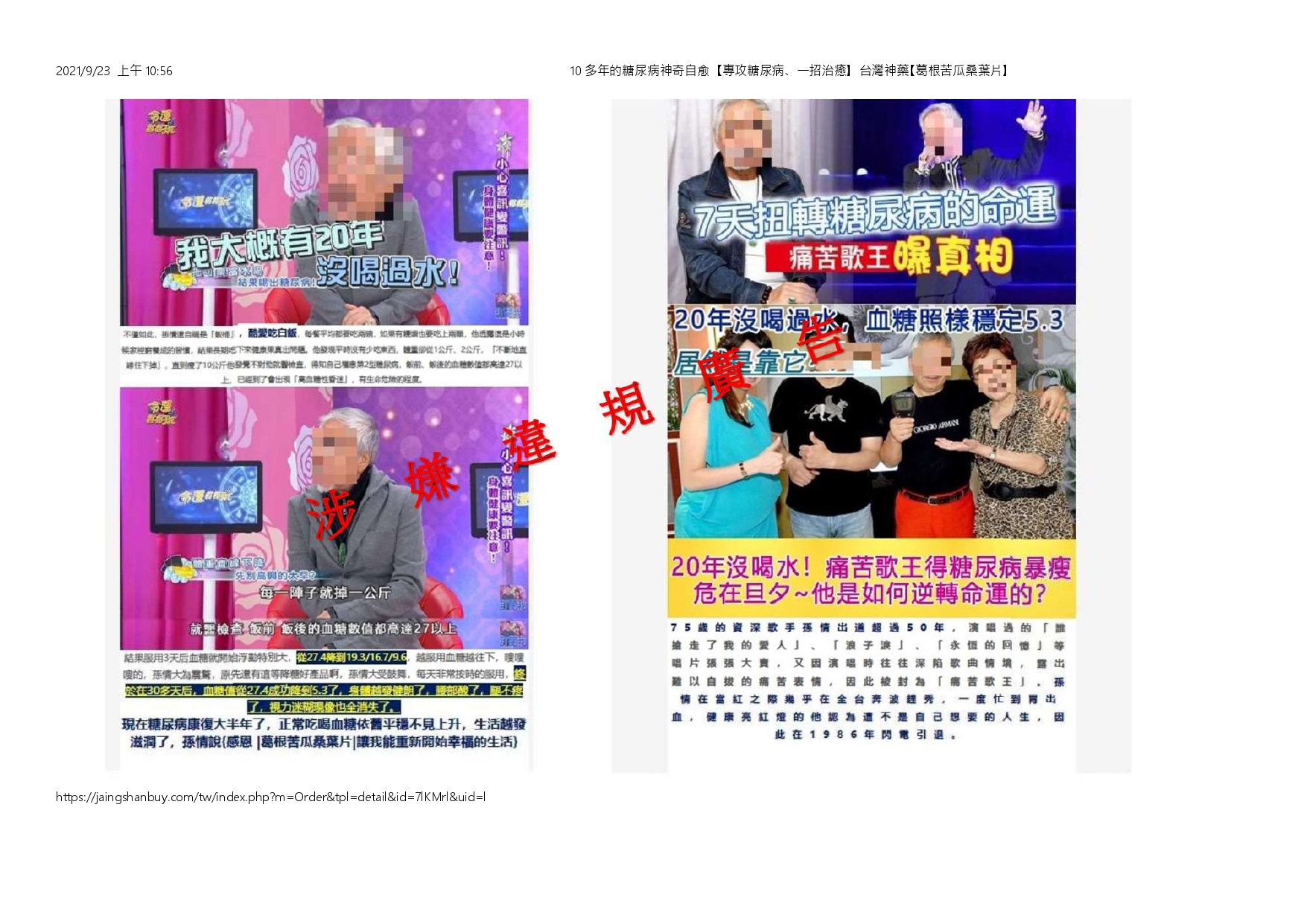 | 涉嫌違規宣稱詞句 | ....20年沒喝過水,血糖照樣穩定5.3 居然是靠它.... |