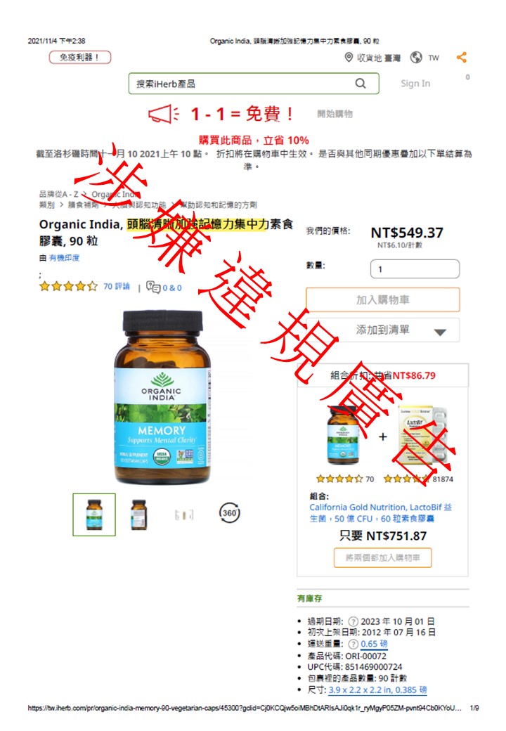 | 涉嫌違規網址 | https://tw.iherb.com/pr/organic-india-memory-90-vegetarian-caps/45300?gclid=Cj0KCQjw5oiMBhDtARIsAJi0qk1r_ryMgyP05ZM-pvnt94Cb0KYoU_njlIz3Vziv2OnuLZ7PQuS-OJcaAjgMEALw_wcB&gclsrc=aw.ds |