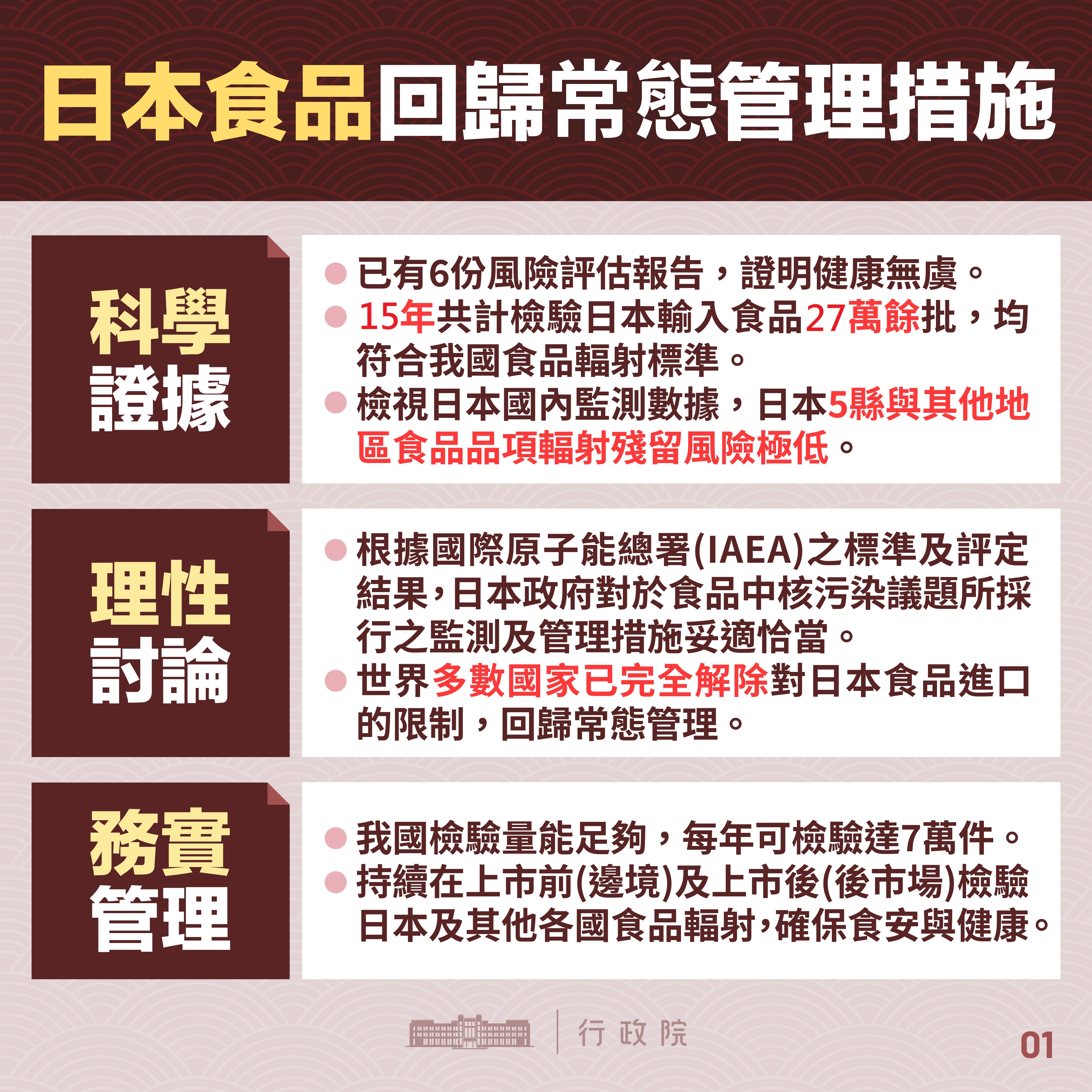 根據國際原子能總署(International Atomic Energy Agency, IAEA)公開資訊顯示,日本政府已採取妥適的監測及因應措施,並依監測結果滾動式更新其國內之食品管制,有效管控食品供應鏈之安全性。