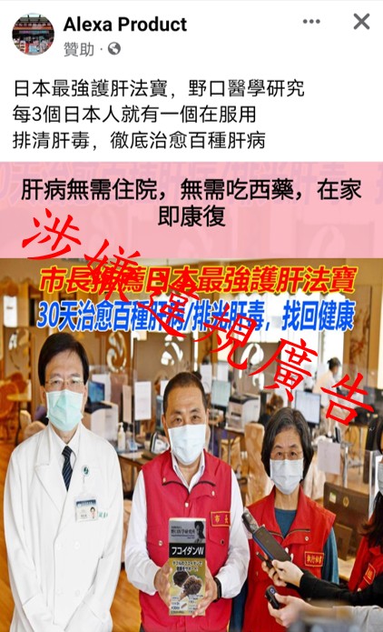| 涉嫌違規宣稱詞句 | ……排清肝毒,徹底治癒百種肝病……肝病無需住院,無需吃西藥,在家即康復……市長推薦日本最強護肝法寶 30天治癒百種肝病/排光肝毒,找回健康…… |