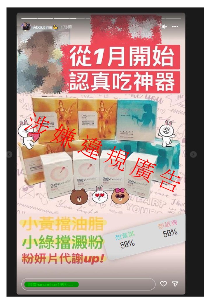 | 涉嫌違規宣稱詞句 | ⋯小黃擋油脂⋯小綠擋澱粉⋯一個月⋯體重降5.8 公斤⋯體脂肪2.2%⋯內臟降2⋯瘦身神器⋯瘦超快的⋯ |