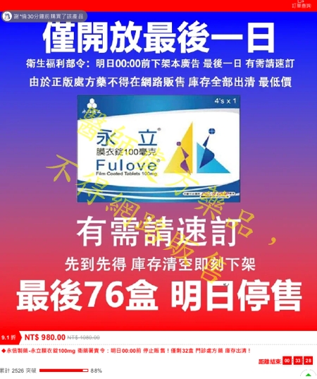 涉嫌違規態樣 我國雖核有與案內「永立膜衣錠100毫克」同品名之藥品許可證,惟案內網頁假借衛生福利部命令,該品非屬我國核准藥品。