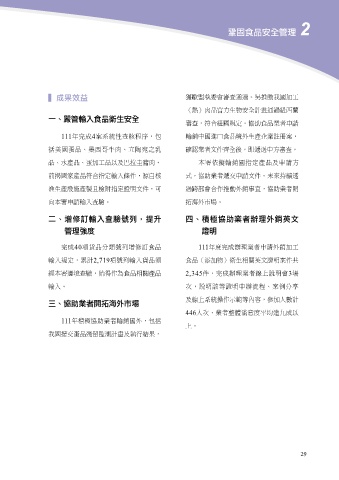 2鞏固食品安全管理 ▍ 成果效益 一、嚴管輸入食品衛生安全 111 4 二、增修訂輸入查驗號列,提升 四、積極協助業者辦理外銷英文 管理強度 證明 40 111 2,719 2,345 3 三、協助業者開拓海外市場 446 111 29