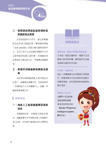 二、發展網路爬蟲監督管理新型 知識補給站 態網路食品業者 演算法是一種解決問題的邏輯思維! web crawlers 三、辦理非洲豬瘟緊急應變及通 ________________ 報 什麼是「機器學習」? ▍ 成果效益 ________________ 一、精進人工智慧機器學習演算 風險因子指的是 技術 BPI BPI 12 Border Prediction Intelligent system, 1.21 BPI 32