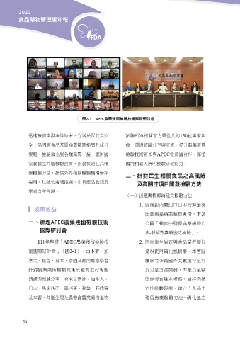 圖2-1 APEC農藥殘留檢驗技術國際研討會 150 APEC 二、針對民生相關食品之高風險 及高關注項目開發檢驗方法 ▍ 成果效益 1. 一、辦理APEC農藥殘留檢驗技術 - 國際研討會 2. 111 APEC 2-1 - 34