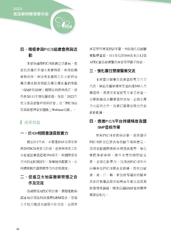 四、積極參與PIC/S組織會務與活 111 104 12 動 APEC PIC/S 三、強化臺日雙邊醫藥交流 GMP GDP 500 111 2022 PIC/S Webinar ▍ 成果效益 四、透過PIC/S平台持續精進我國 GMP查核作業 一、於ICH相關會議貢獻實力 PIC/S 111 45 PIC/S 28 ICH 196 ICH PIC/S PIC/S 二、促進亞太地區醫藥管理之合 GMP 作及交流 APEC GRM 46