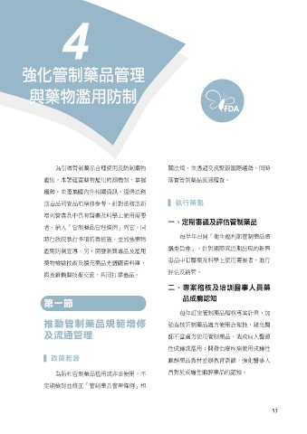 4 強化管制藥品管理 與藥物濫用防制 ▍ 執行策略 一、定期審議及評估管制藥品 第一節 二、專案稽核及培訓醫事人員藥 推動管制藥品規範增修 品成癮認知 及流通管理 ▍ 政策起源 53