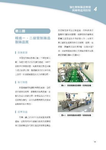 4強化管制藥品管理 與藥物濫用防制 第二節 5 7 精進一、二級管制藥品 4-1 4-2 製藥品質 ▍ 政策起源 109 110 ▍ 執行策略 圖4-1 溶液劑產線設備圖-充填線設備 ▍ 成果效益 圖4-2 溶液劑產線設備圖-包裝線設備 55 111