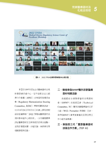 5完善醫療器材及 化粧品管理 圖5-1 2022 TFDA法規科學卓越中心研討會 109 二、積極參與GHWP體外診斷醫療 器材相關活動 APEC Regulatory Harmonization Steering GHWP Technical Committee, RHSC 111 8 26 9 11 Committee, TC 2022 TFDA WG2- Premarket: IVDD GHWP 三、推動第三代「臺歐醫療器材 技術合作方案」(TCP III) 69