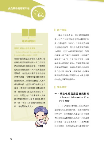 ▍ 執行策略 知識補給站 GMP 108 7 1 國際化粧品法規合作會議 5 International Cooperation on Cosmetics Regulation, ICCR 113 7 1 2016 ICCR ICCR ▍ 成果效益 2020 一、精進化粧品產品資訊檔案 ICCR (Product Information File, 2023 7 ICCR-18 PIF)制度 111 6 16 111 7 28 72