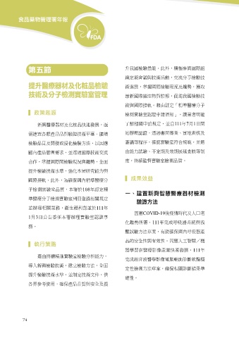 第五節 提升醫療器材及化粧品檢驗 技術及分子檢測實驗室管理 ▍ 政策起源 111 7 1 108 ▍ 成果效益 111 一、建置新興智慧醫療器材檢測 13 驗證方法 ▍ 執行策略 COVID-19 111 111 74