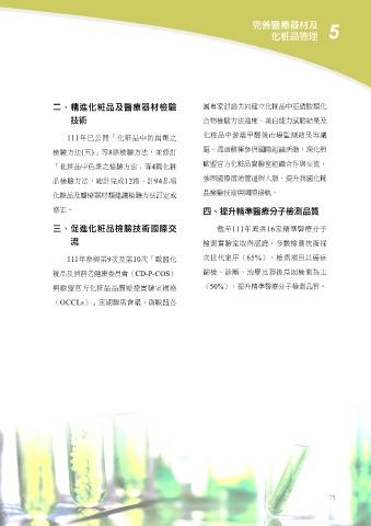 5完善醫療器材及 化粧品管理 二、精進化粧品及醫療器材檢驗 技術 111 8 () 12 4 94 三、促進化粧品檢驗技術國際交 四、提升精準醫療分子檢測品質 流 111 16 111 9 10 CD-P-COS 65% OCCLs 50% 75