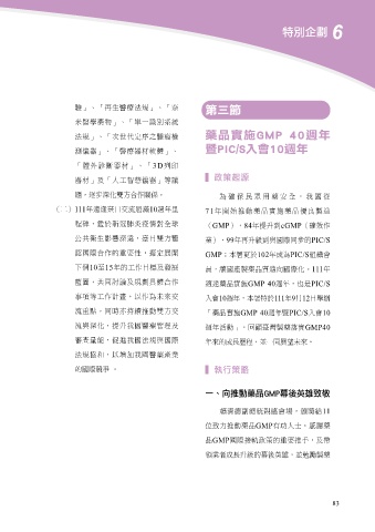 6特別企劃 3D 第三節 111 10 藥品實施GMP 40週年 暨PIC/S入會10週年 10 15 ▍ 政策起源 71 GMP 84 cGMP 99 PIC/S GMP 102 PIC/S 111 GMP 40 PIC/S 10 111 9 12 GMP 40 PIC/S 10 GMP40 ▍ 執行策略 一、向推動藥品GMP幕後英雄致敬 11 GMP GMP 83