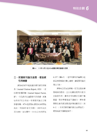 6特別企劃 圖6-4 111年10月13日JFDA經驗分享討論會大合照 二、把關期刊論文品質,增加被 6.157 6-3 引用機會 JFDA JFDA 87 SCI Journal Citation Report, JCR 6-1 30 Journal Impact Factor, IF JCR 7 87 JFDA IF 0.145 104 1 105 3.048 111 IF 89